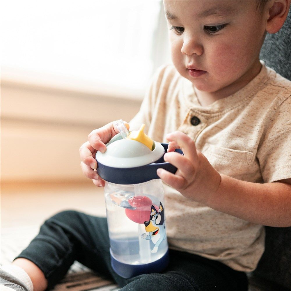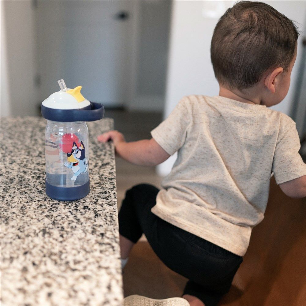 Thirsty toddlers will love staying hydrated with the Bluey Sip & See Water Bottle! The straw features a cute balloon charm that floats on the drink — and as your little one sips, the balloon dips to the bottom, encouraging them to keep drinking. With a flip-top cover to prevent leaks and DropGuard™ bumpers on the lid and base to reduce breakage, this bottle is both fun and practical. Plus, all parts are top-rack dishwasher safe for easy clean-up.
