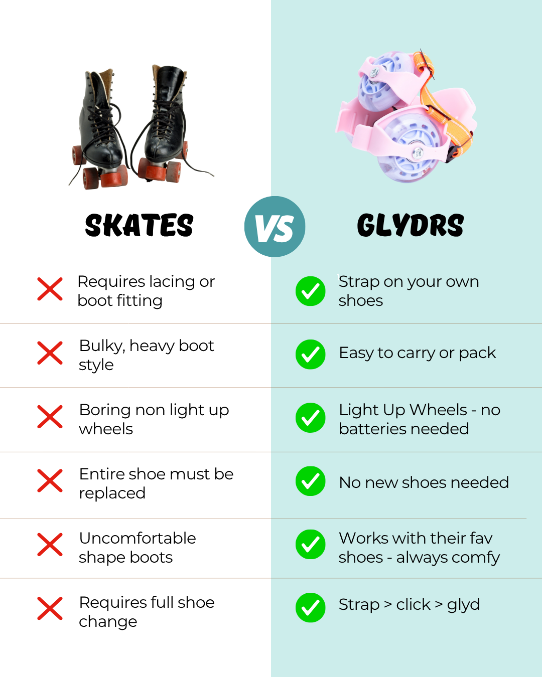 Clip-on heel skates that turn any pair of sneakers into light-up skates.