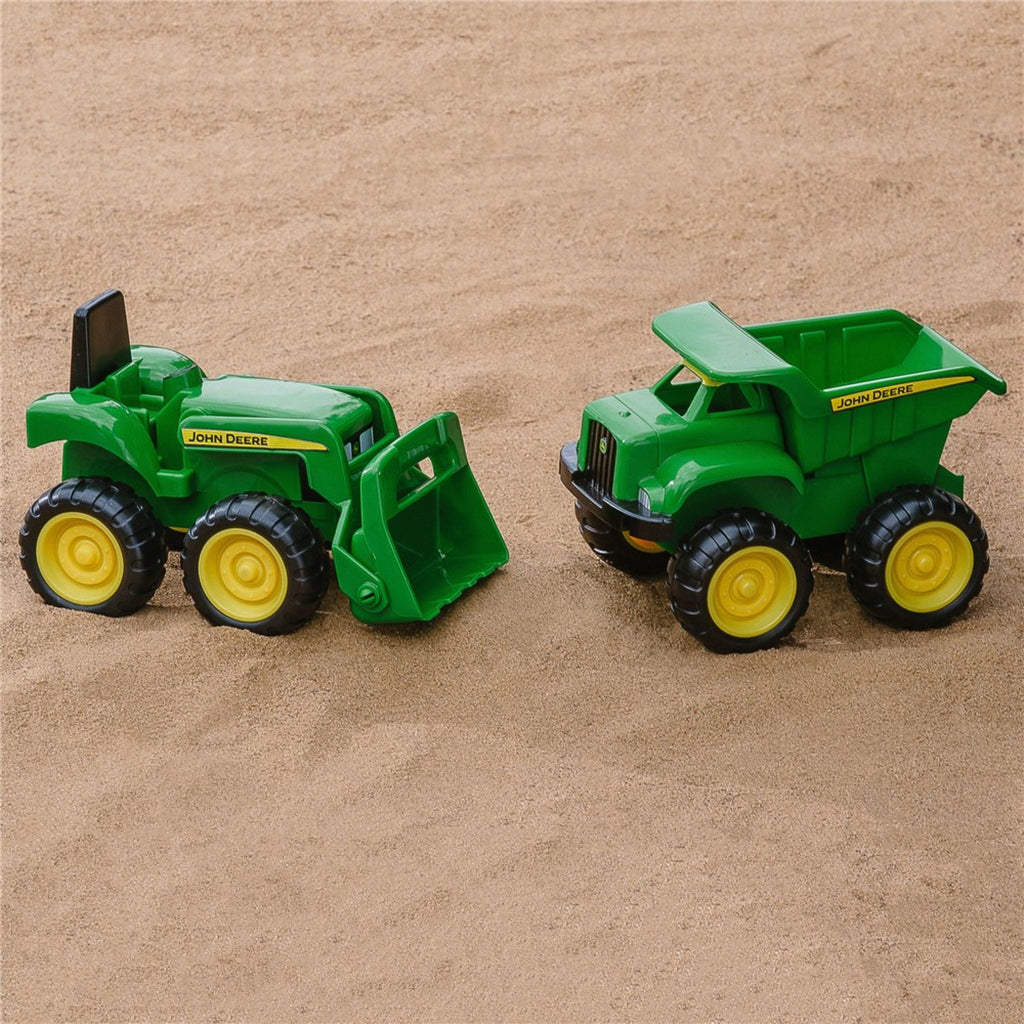 Choose the John Deere Dump Truck featuring a working dump bed or the John Deere Tractor with a working front loader. Or get both for a pair of fun toys!